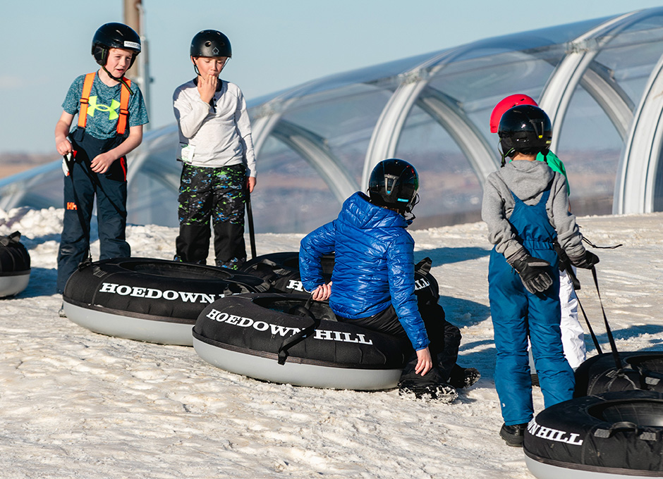 This season, tubing at Hoedown Hill looks a little different. The new Greenhorn Hill is designed for easy, family-friendly fun with shorter runs, quicker laps, and an open-flow layout. This means no lanes, just simple sliding.